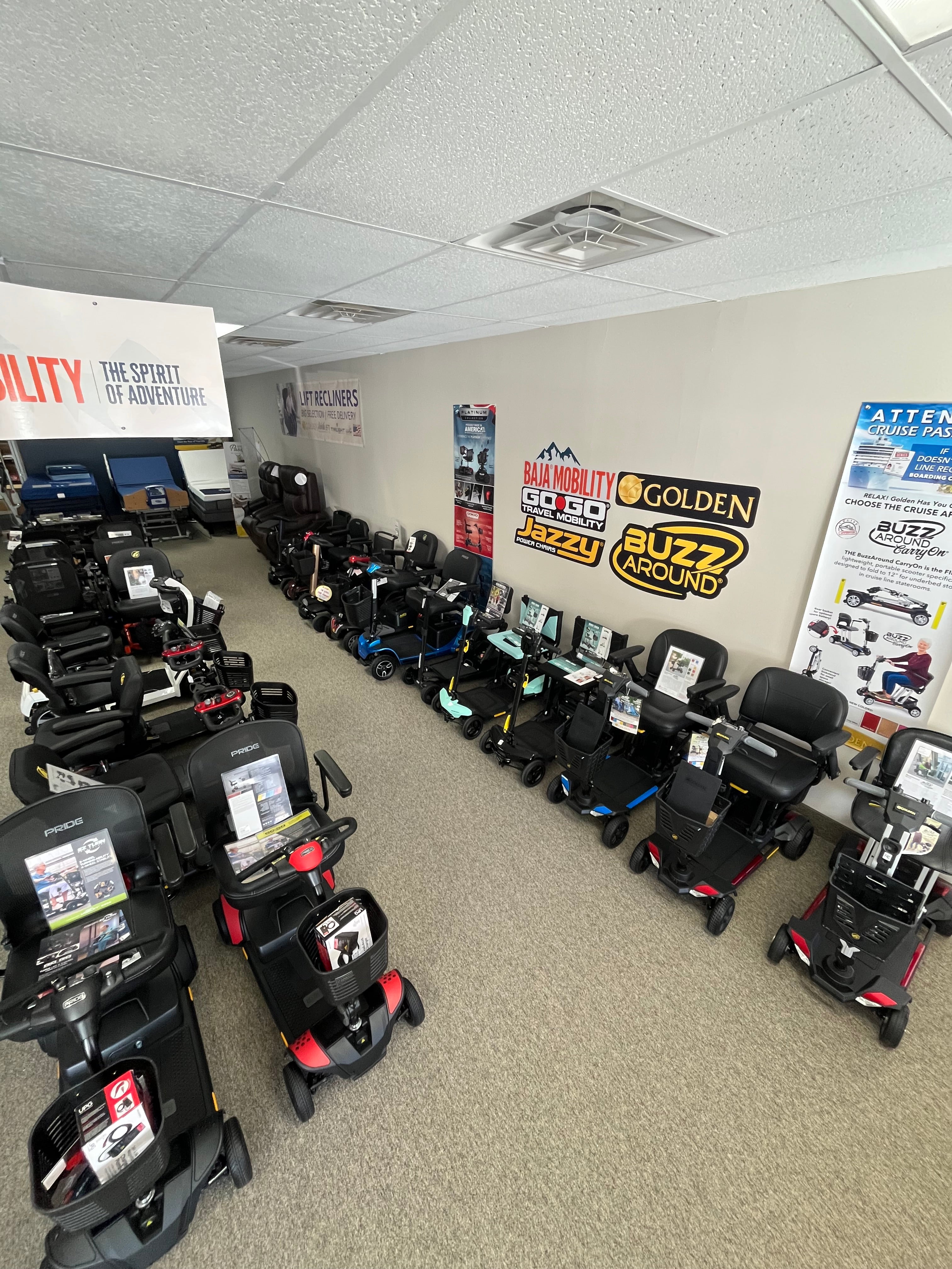 Golden Tech, Buzzaround, Pride Mobility, GoGo, Jazzy, Baja, Vive, Drive Medical, and WHILL