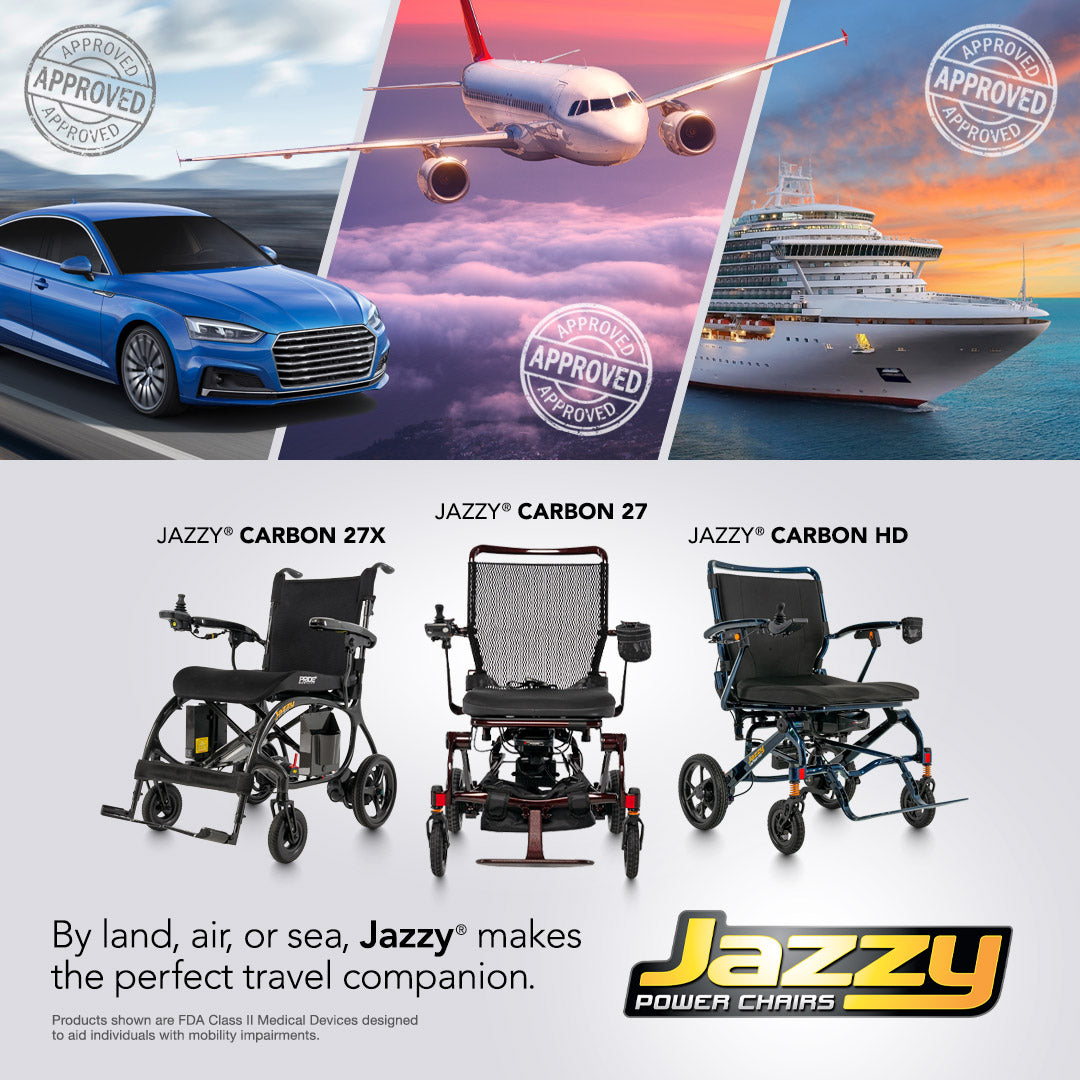 Weighing just 32 lbs. and boasting a 400-lb. weight capacity, the Jazzy Carbon HD is a game-changing heavy-duty travel power wheelchair. It folds and locks in seconds and provides a comfortable, "jerk-free" (controller) ride.