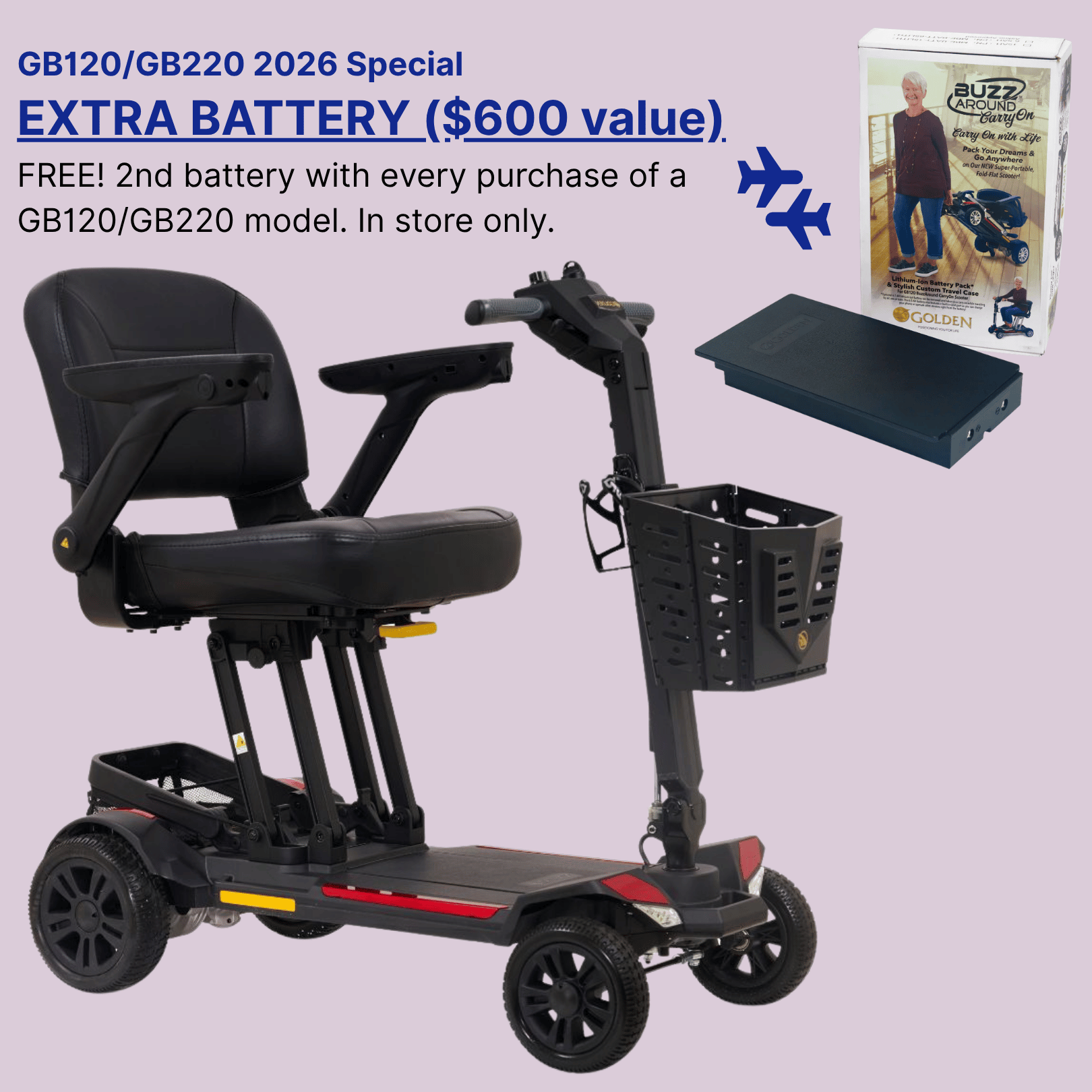 Get out and explore the warm weather coming! Sales promos for the GB120/GB220. Available for demo in store or in home. More sales on Scooters, Powerchairs, & Rollators in store only.