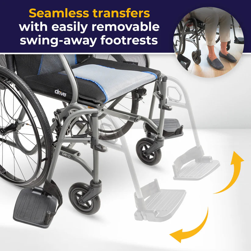 Whether navigating daily errands independently or with caregiver support, the AeroFly™ provides the confidence and convenience serious wheelchair users demand. *Transport weight excludes rear wheels, anti-tippers, and footrests; total weight with rear wheels is 19 lbs.