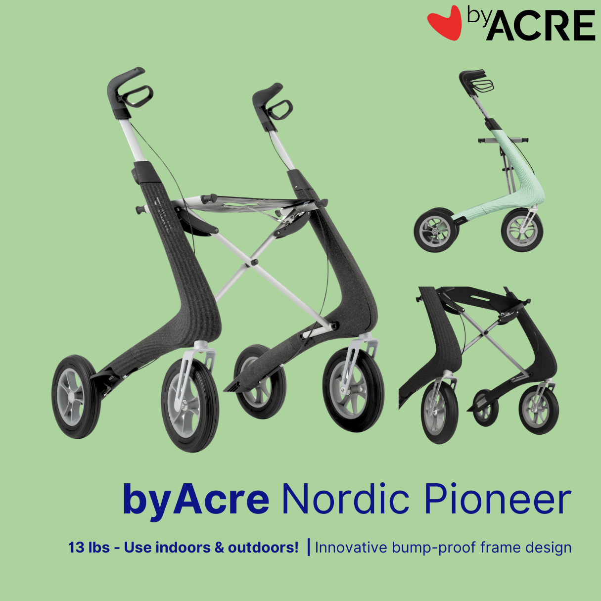 The ByAcre Nordic Pioneer Rollator is a sleek, ultra-lightweight, and durable mobility rollator designed for individuals who refuse to compromise on style, performance, or comfort.