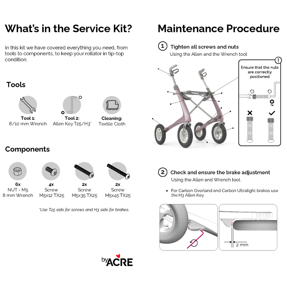 Our Service Kit for the Carbon Ultralight, Carbon Overland, and Nordic Pioneer includes everything you need to tune up your rollator: