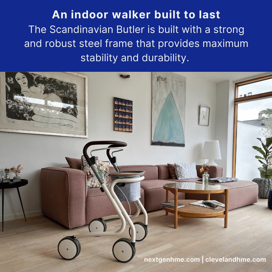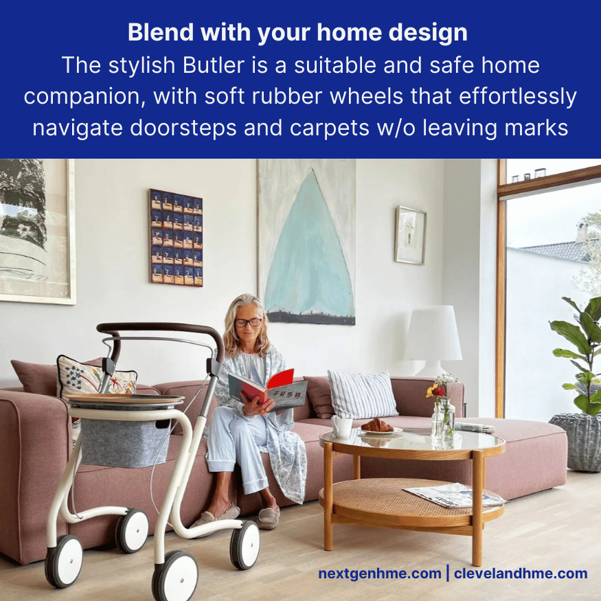 The stylish Scandinavian Butler is a suitable and safe home companion, with soft rubber wheels that effortlessly navigate doorsteps and carpets without leaving marks and provides maximum stability for your safety at home.