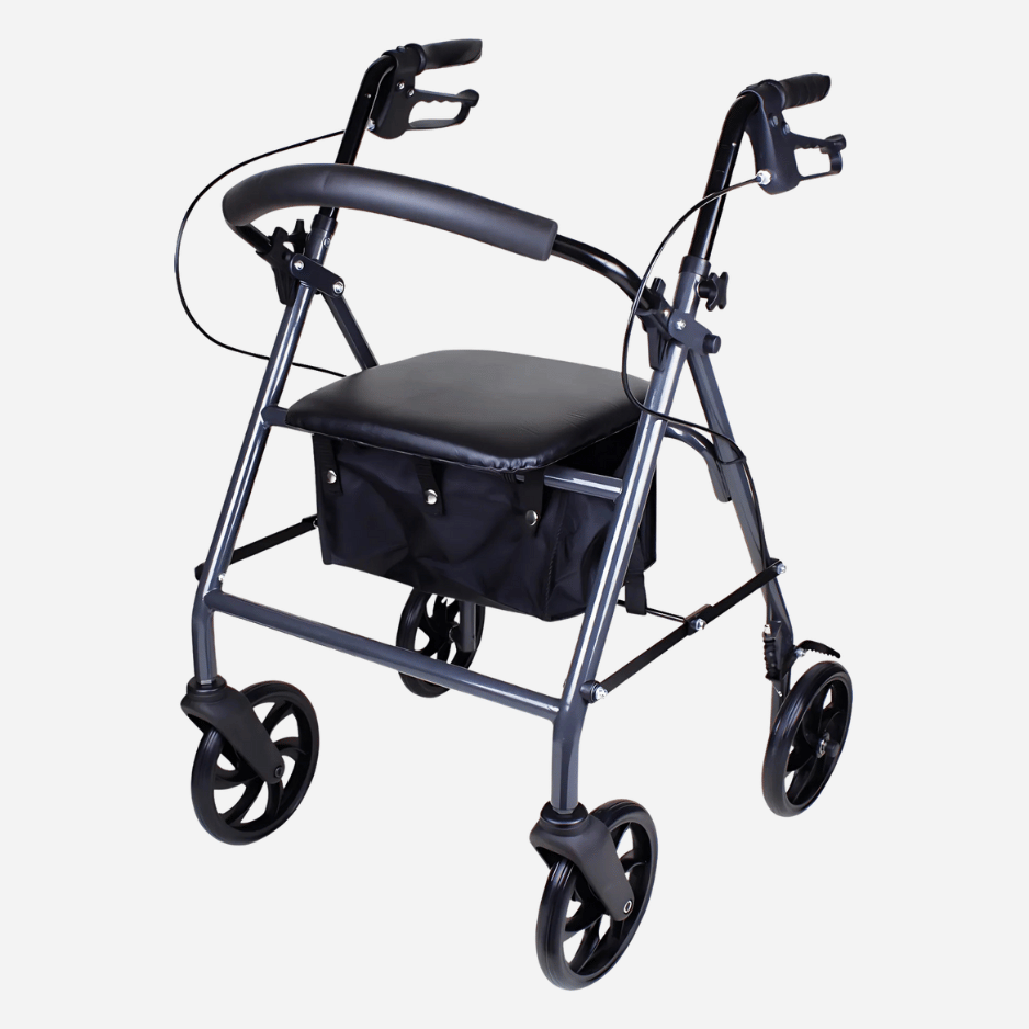 The Classics Steel Rollator is equipped with locking hand brakes for safety and is height adjustable. The padded seat and backrest provide comfort while seated. A large bag located under the seat keeps personal items secure. This walker folds easily for storage and transport. No assembly is required.