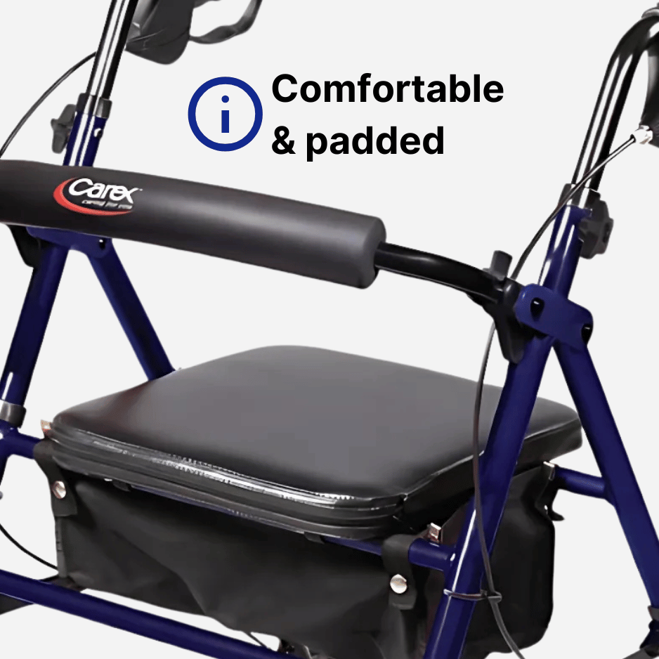 The Carex Step 'N Rest Rollator assists users with mobility and provides them with a place to sit down and take a rest. It can be folded up easily for travel or storage and features height adjustable handles to accommodate a range of users.