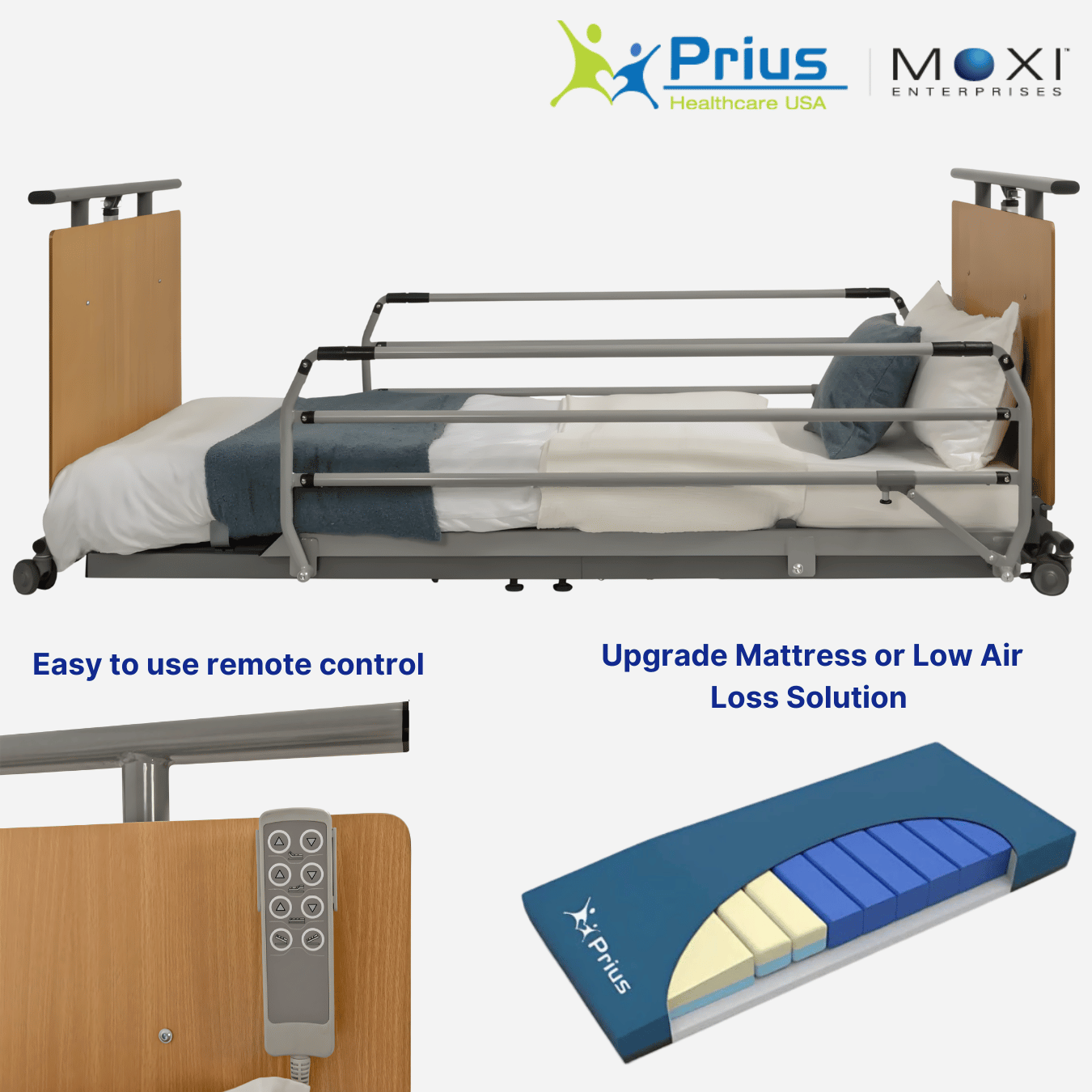 - Medical Bed for long term patient care at home, assisted living, independent living, hospice, memory care, or rehabilitation.