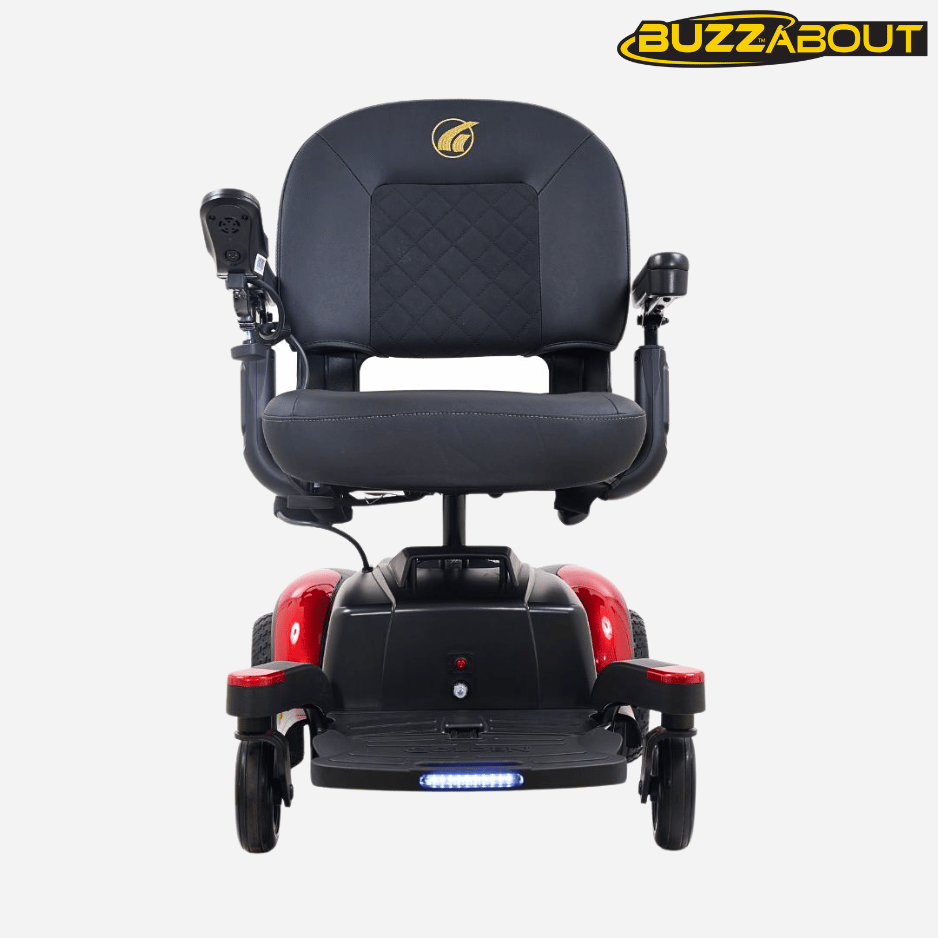 This compact, portable chair features motion-sensing LED lights on the footplate and rear handle that activate with joystick movement for added safety and visibility. The BuzzAbout also offers convenient offboard charging, easy disassembly for transport, and excellent maneuverability—indoors or out.
