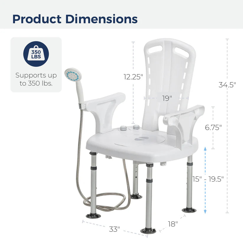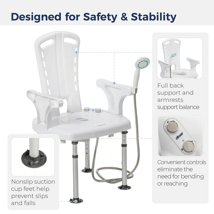 - Unique shower chair with bidet and shower spray enables full-body cleansing while seated