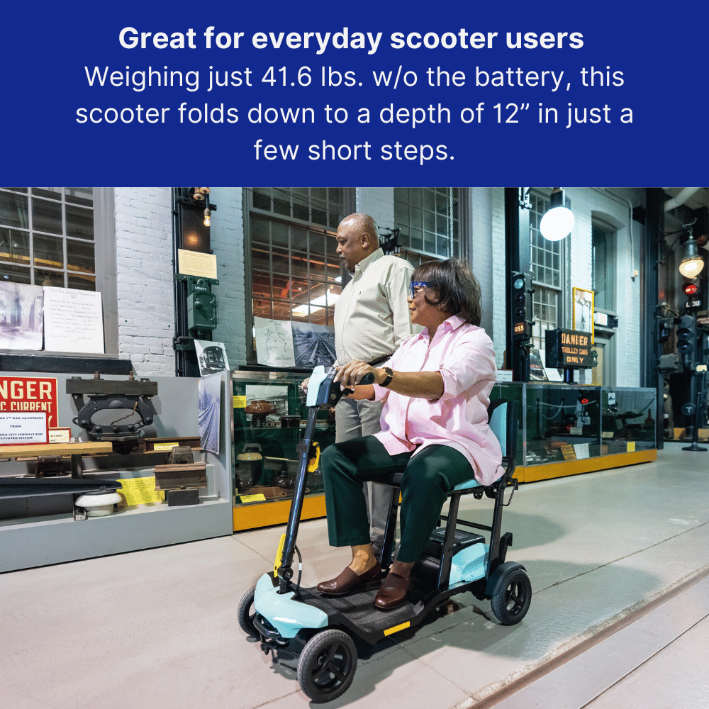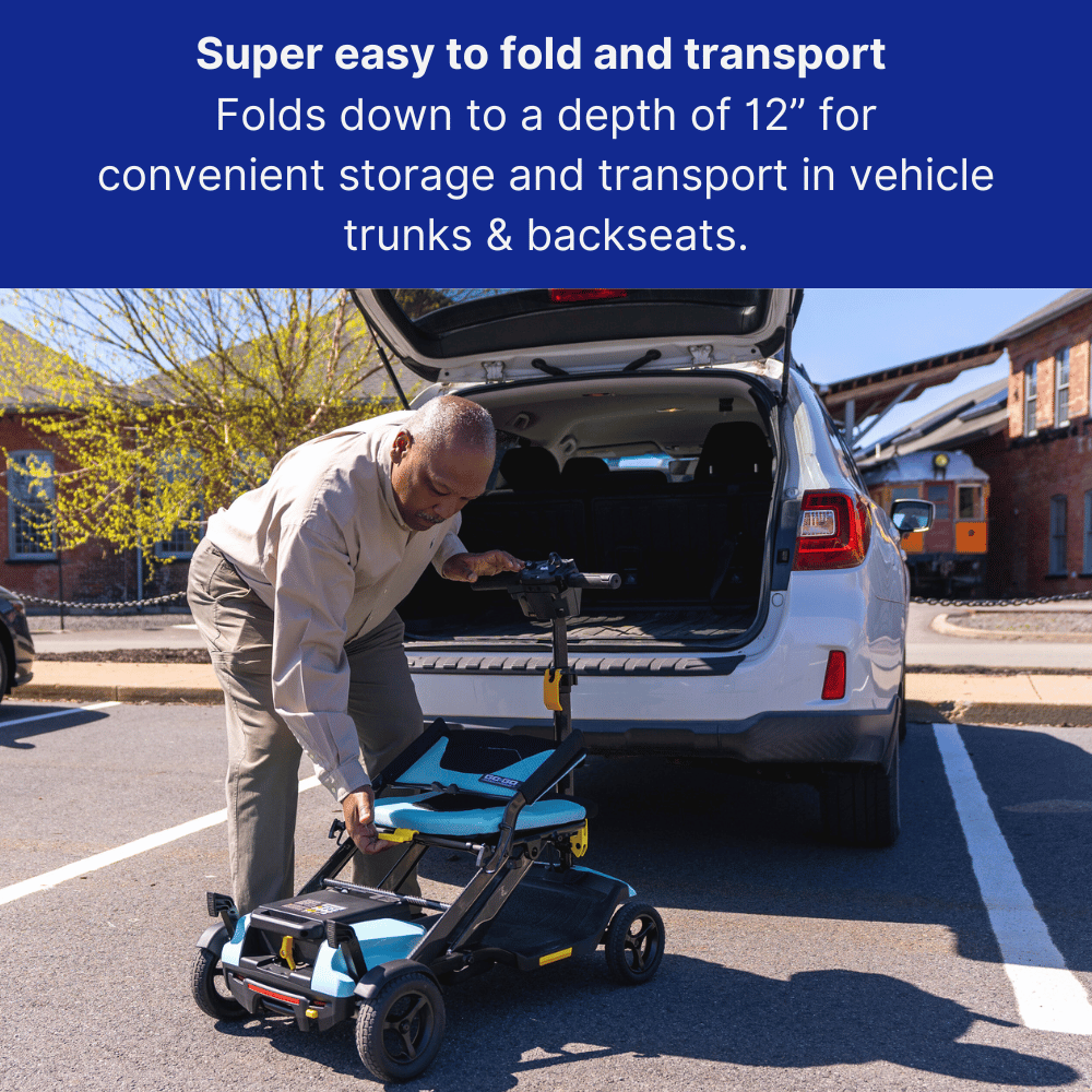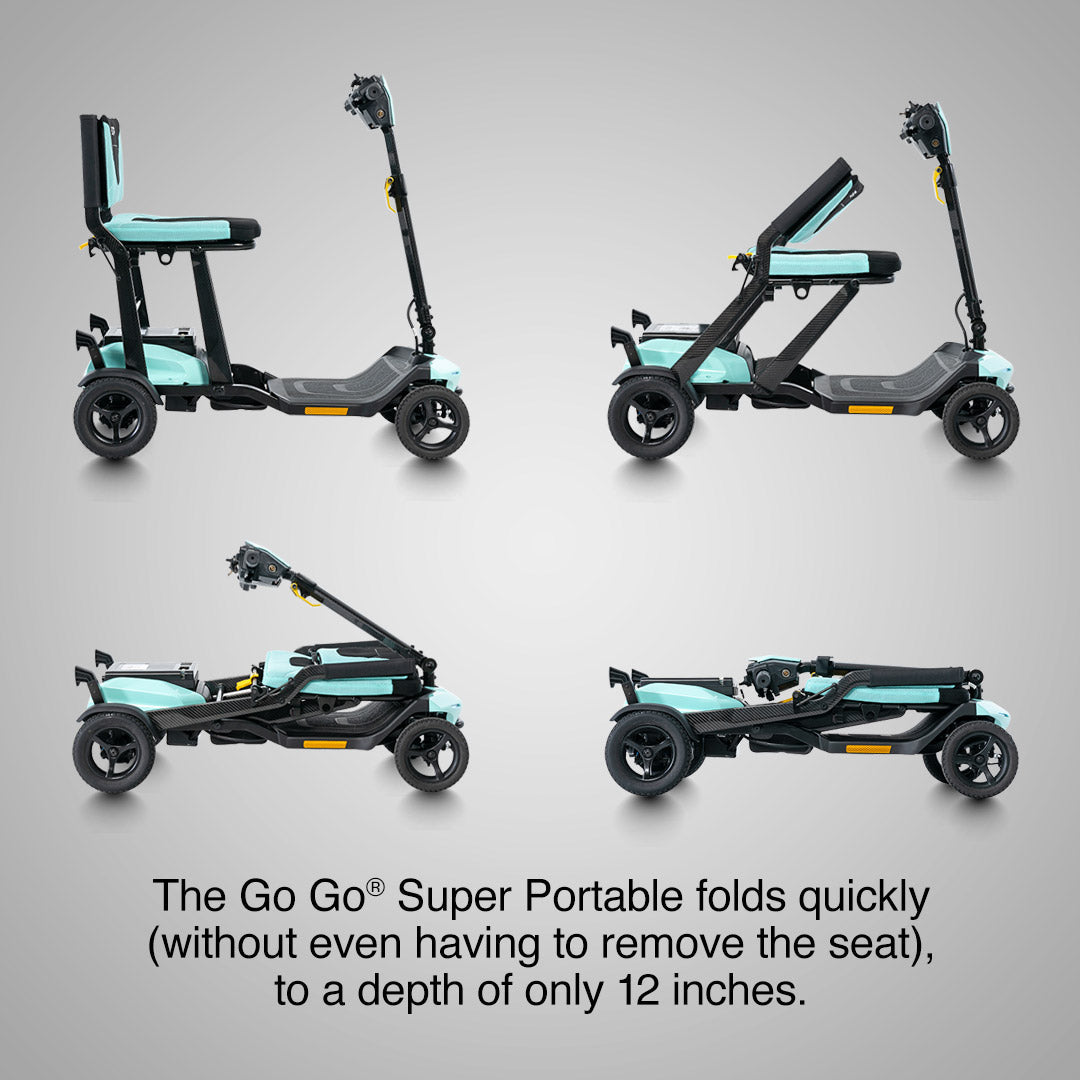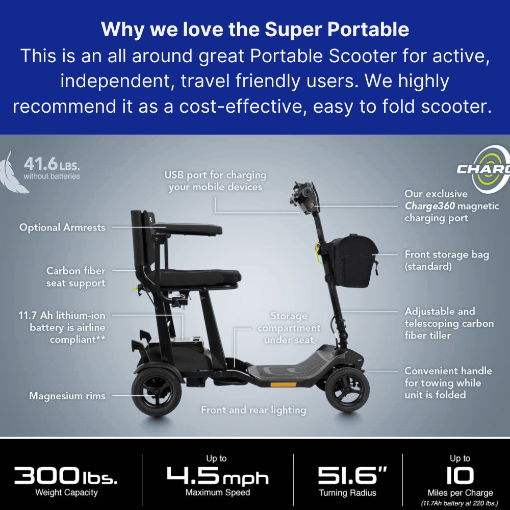 The Pride Mobility Go Go Super Portable Scooter is a lightweight, compact mobility solution designed for maximum convenience. With Charge360 magnetic charging technology, this scooter provides hassle-free recharging, and its ultra-portable design makes it perfect for travel.