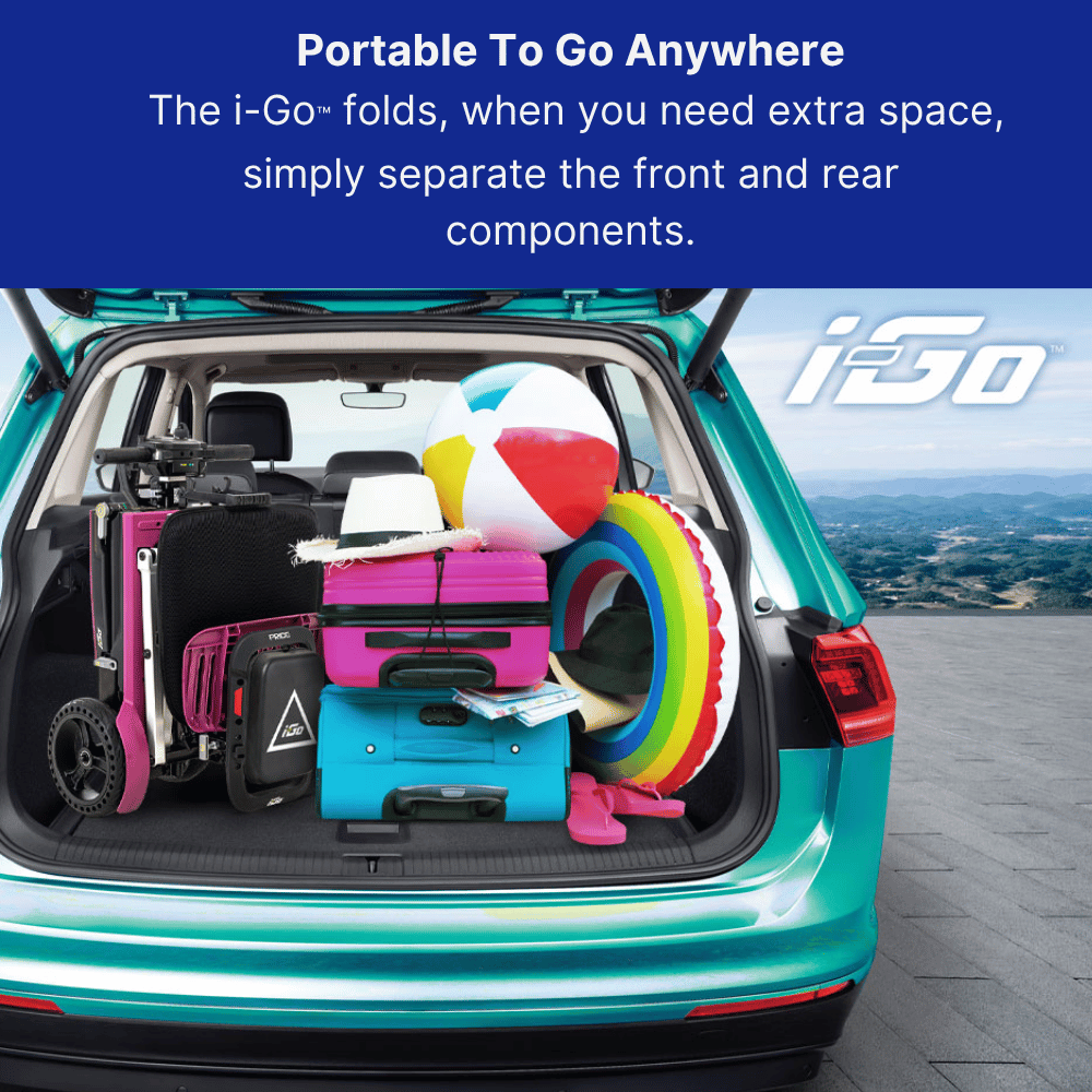 The i-Go™ Folding Scooter is the latest super portable mobility device by Pride Mobility and will open your world to new experiences. It folds down for easy stowing, disassembles into two pieces that weigh just 32 pounds each and is one of the most portable, travel-friendly devices that provides all-day power and mobility.