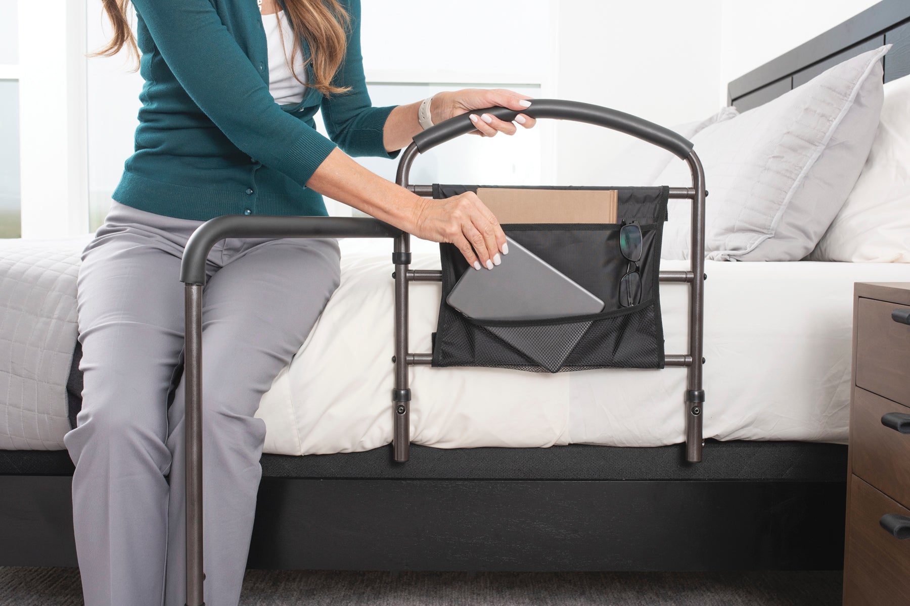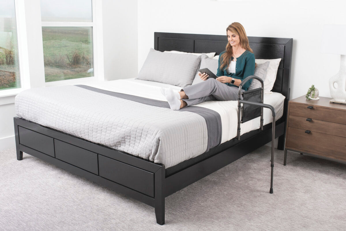 Getting out of bed just got easier with the Mobility Bed Rail from Stander. The unique swing-out mobility arm is perfect for anyone that has to transfer out of bed to a wheelchair or walker. The swing-out arm will move w ith you as you get out of bed and will give you a sturdy hand to hold every step of the way.