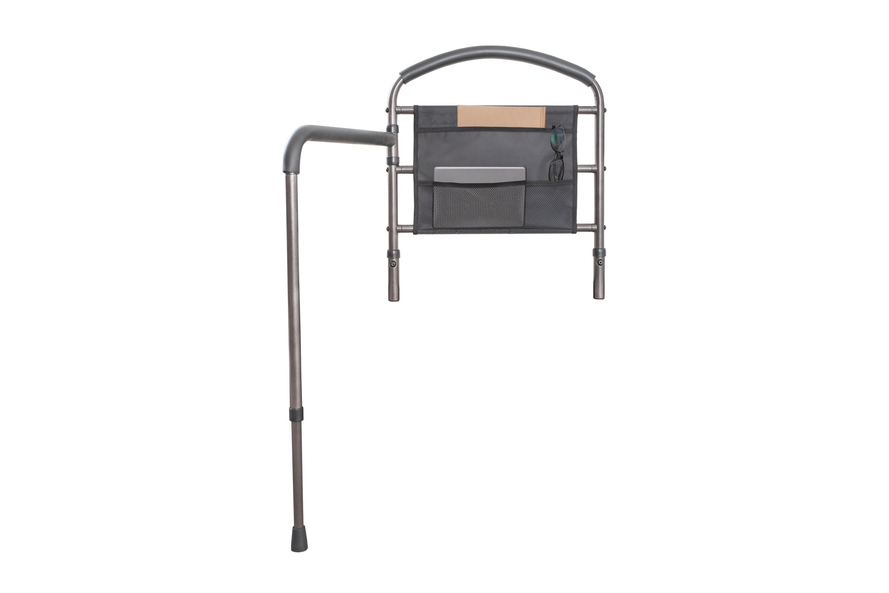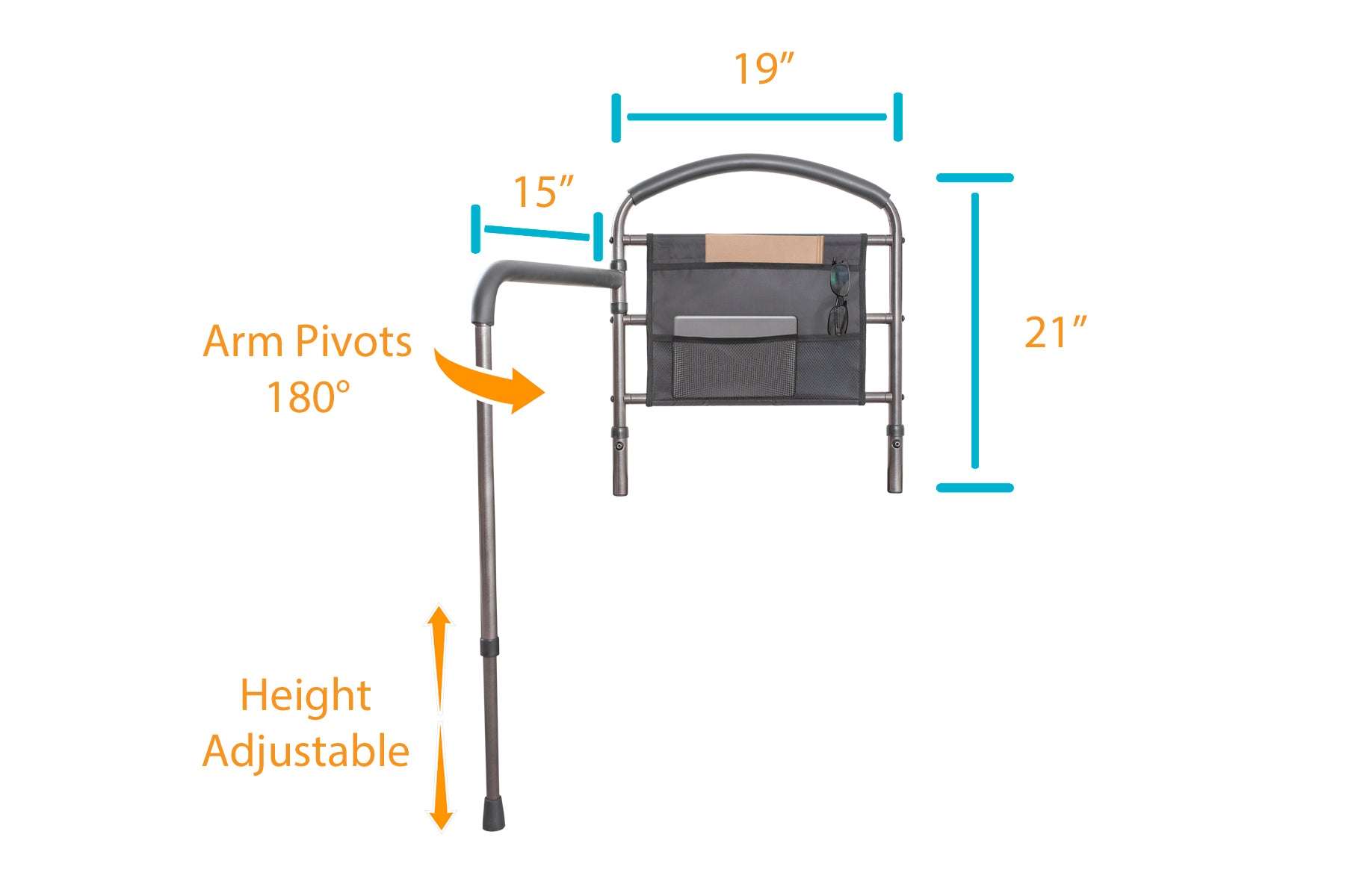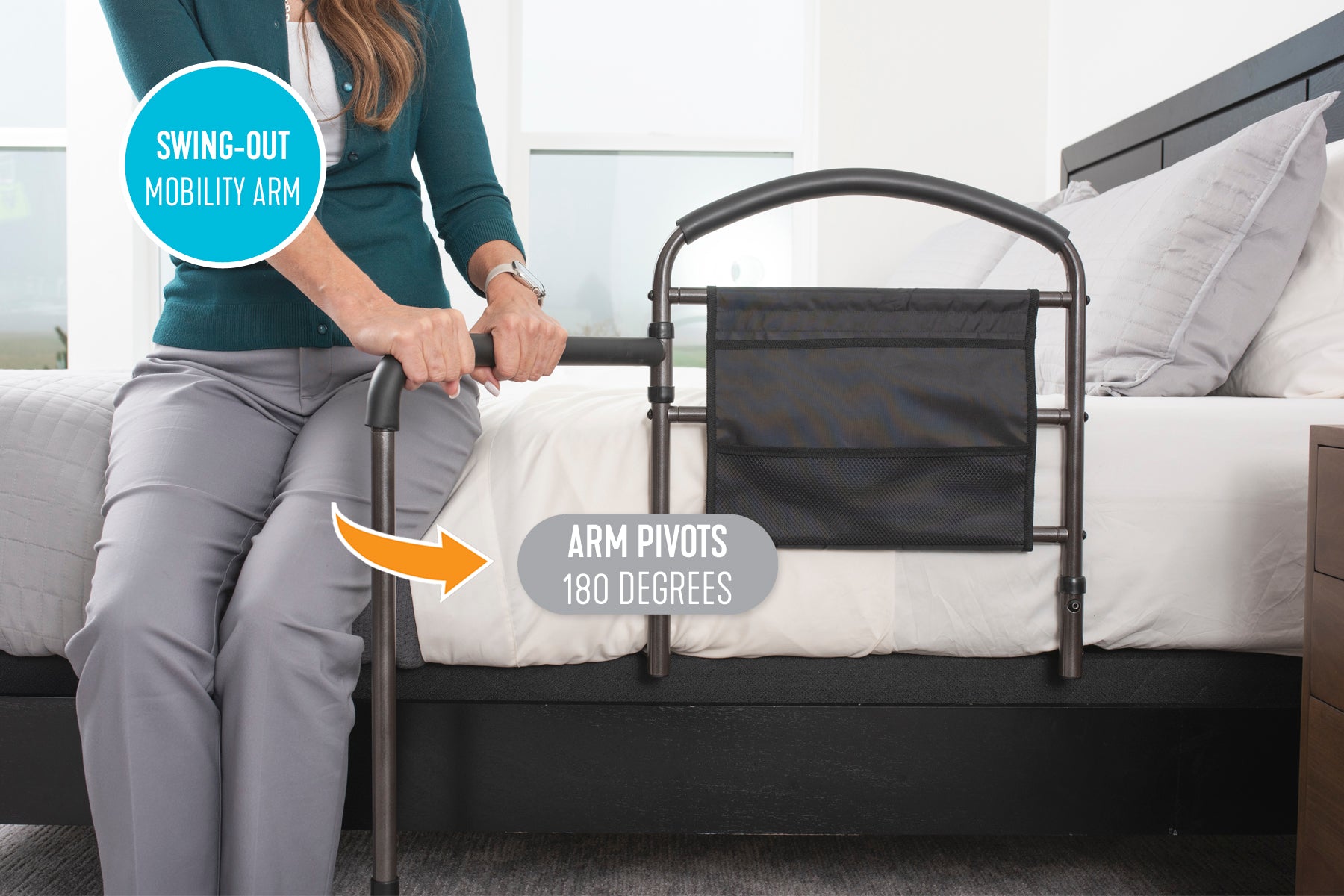 - Swing-out Mobility Arm: The pivoting handle swings out 180 degrees to assist in transferring away from the bed. Plant the non-slip leg firmly on the floor and pick it up as you move.