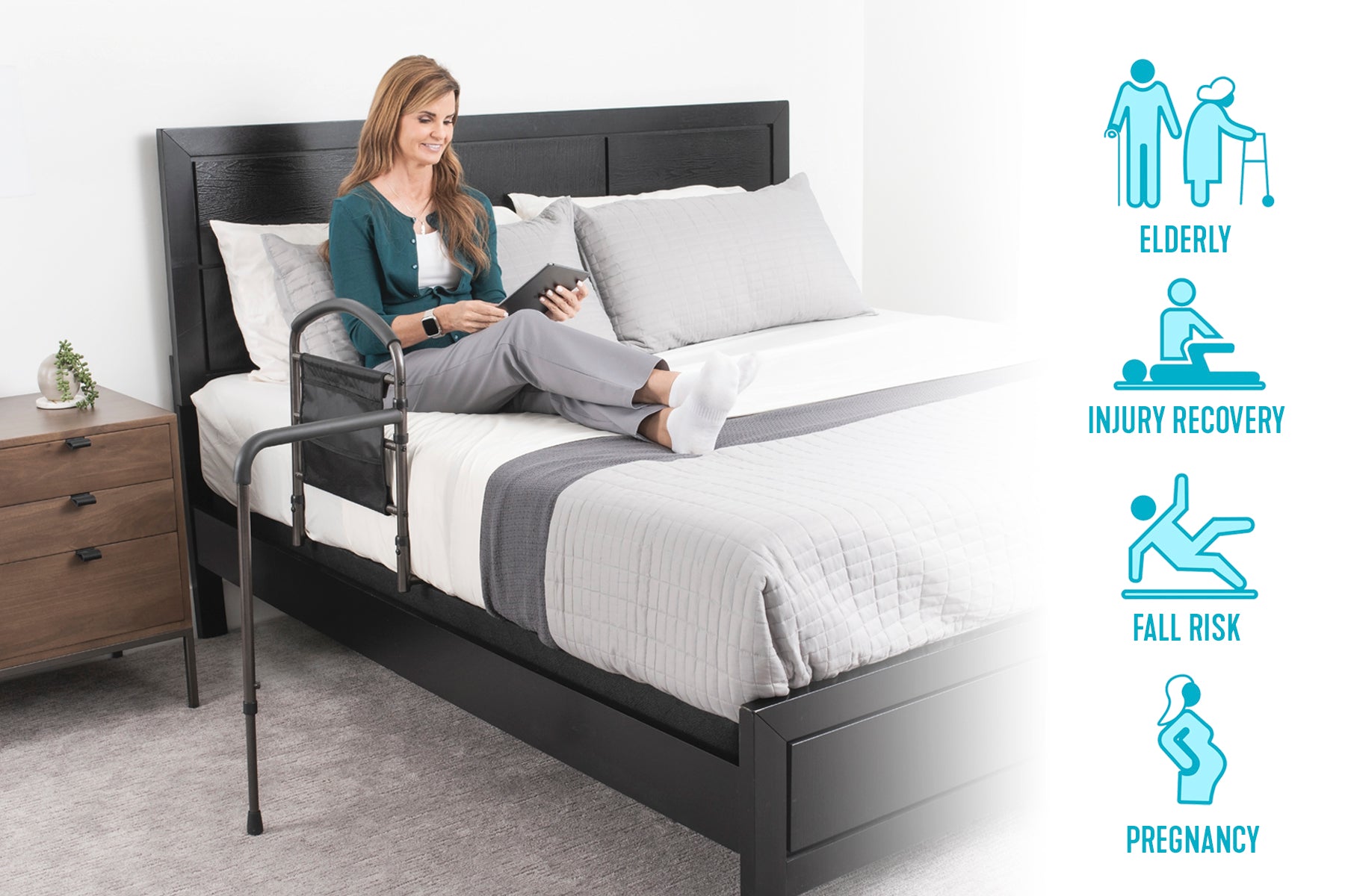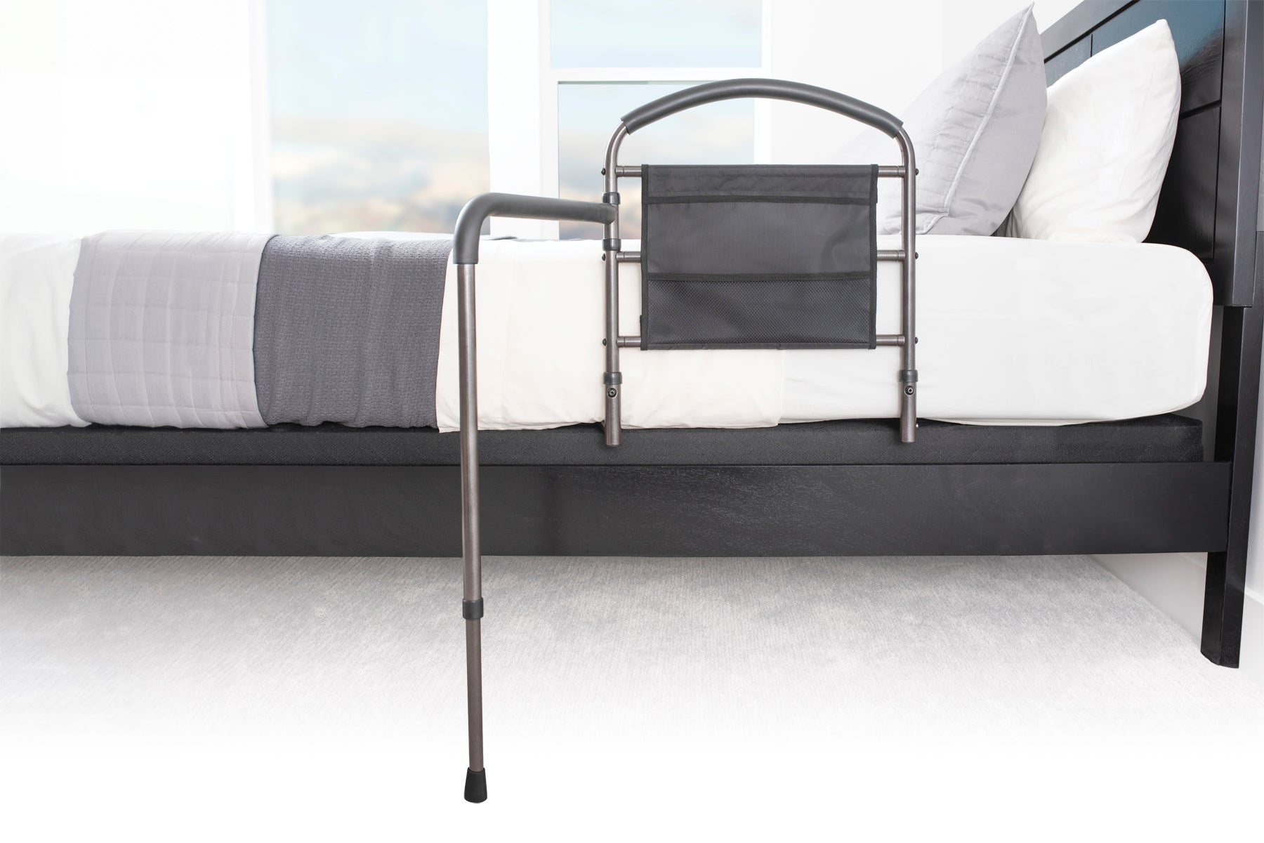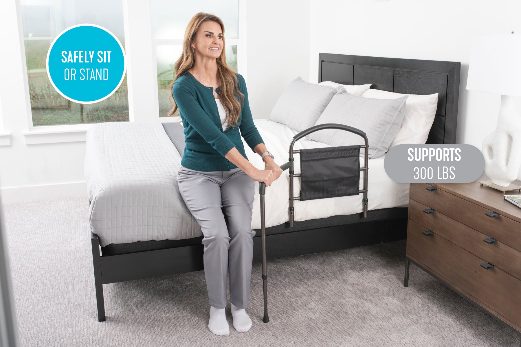 - Support Handle: The ergonomic and padded handle of the Mobility Bed Rail helps to provide balance and support when transferring from bed while withstanding weights up to 300 pounds.