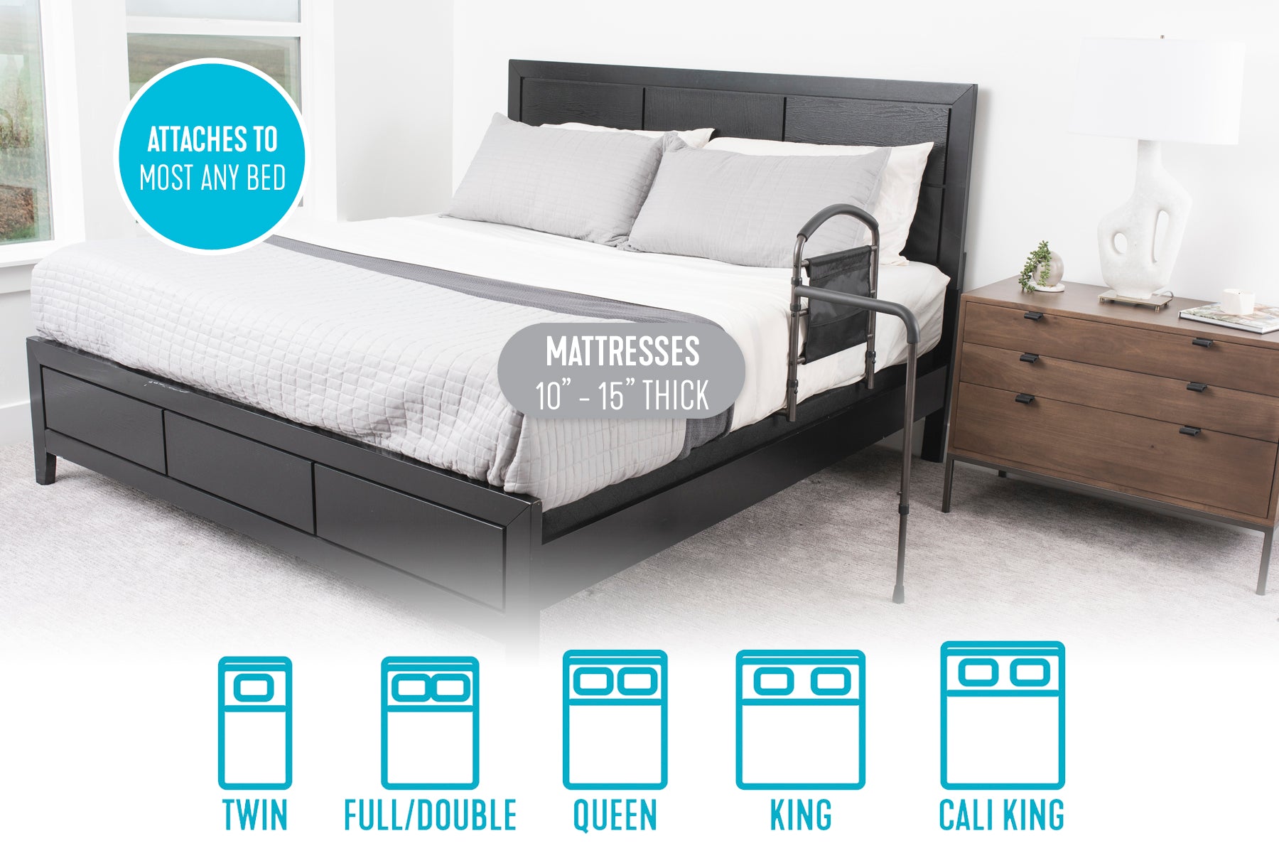 - Compatibility: The Mobility Bed Rail works with most traditional bed types with mattresses between 10″ and 15″ thick. Use the rail with any mattress size from a Twin to a California King. It is not intended to be used with adjustable beds. Do not use with an extra soft mattress.