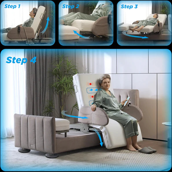 Featuring a motorized 90° rotation, this bed allows users to easily transition from lying down to a seated position, reducing strain on caregivers and enhancing user autonomy.