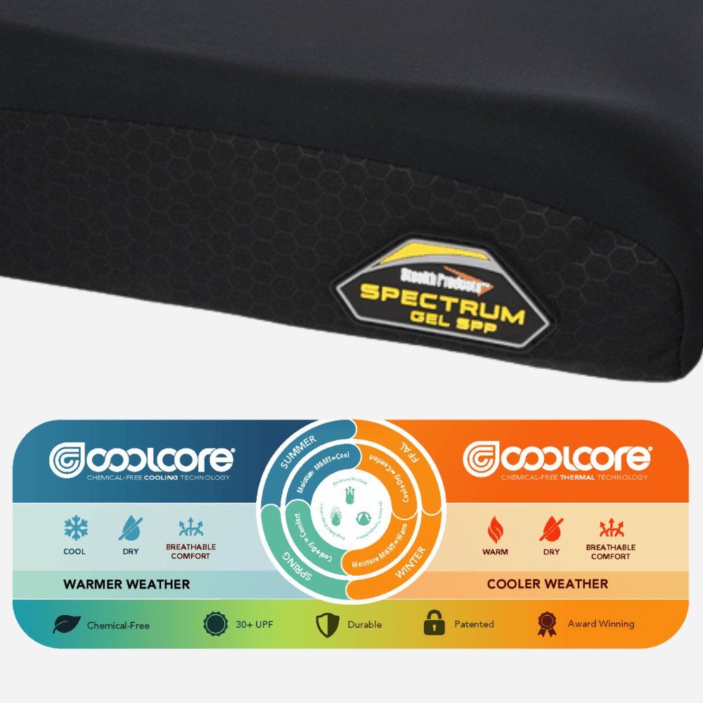 The Essence SPP includes a breathable CoolCore® cover—a chemical-free, four-way stretch nylon fabric interwoven with Elastane to wick moisture, regulate temperature, and ensure year-round user comfort. Ideal for users needing a moderate level of positioning with skin protection, this cushion is a dependable choice for everyday seating and clinical environments.