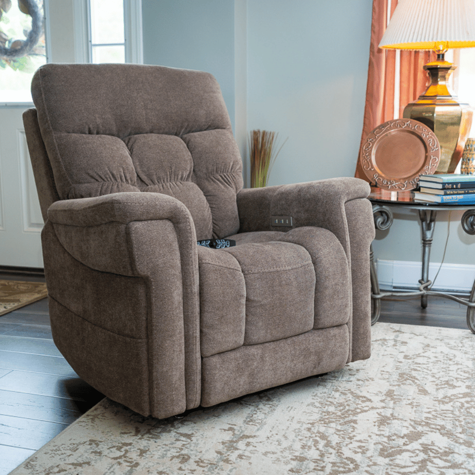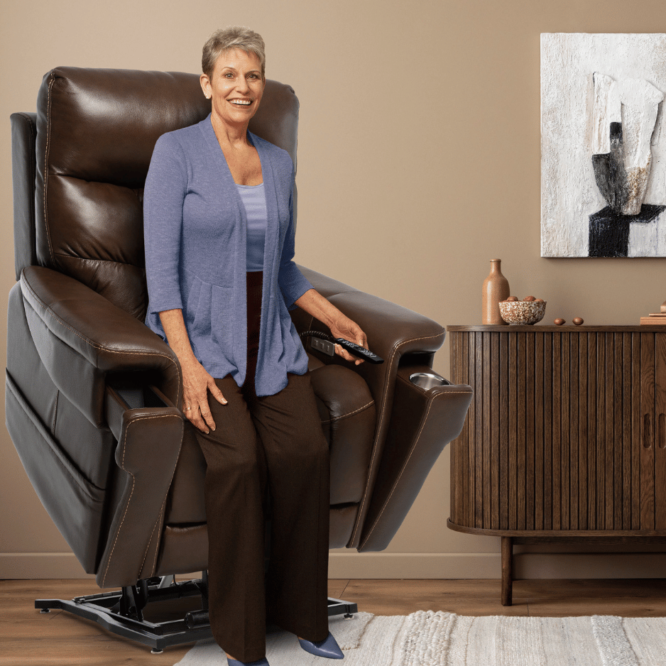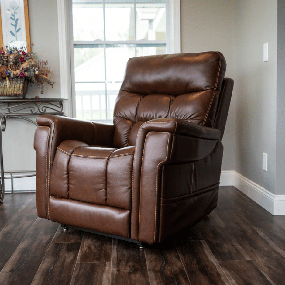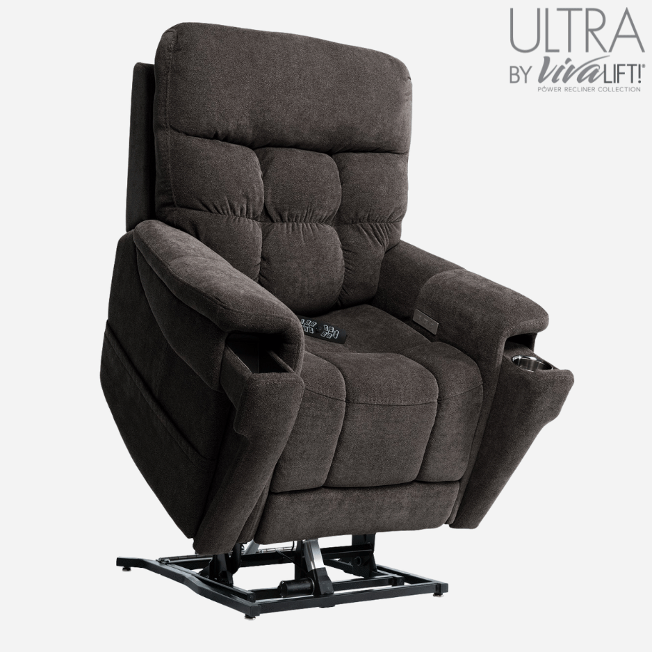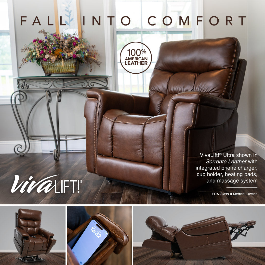 VivaLift! Ultra comes in three sizes: small, medium, and large. In addition to its standard CAPRICCIO fabric in cappuccino, dove, slate, and smoke, it’s now available in SORRENTTO coffee, which is 100% American leather (medium), and TRENTO brown and charcoal (medium and large).