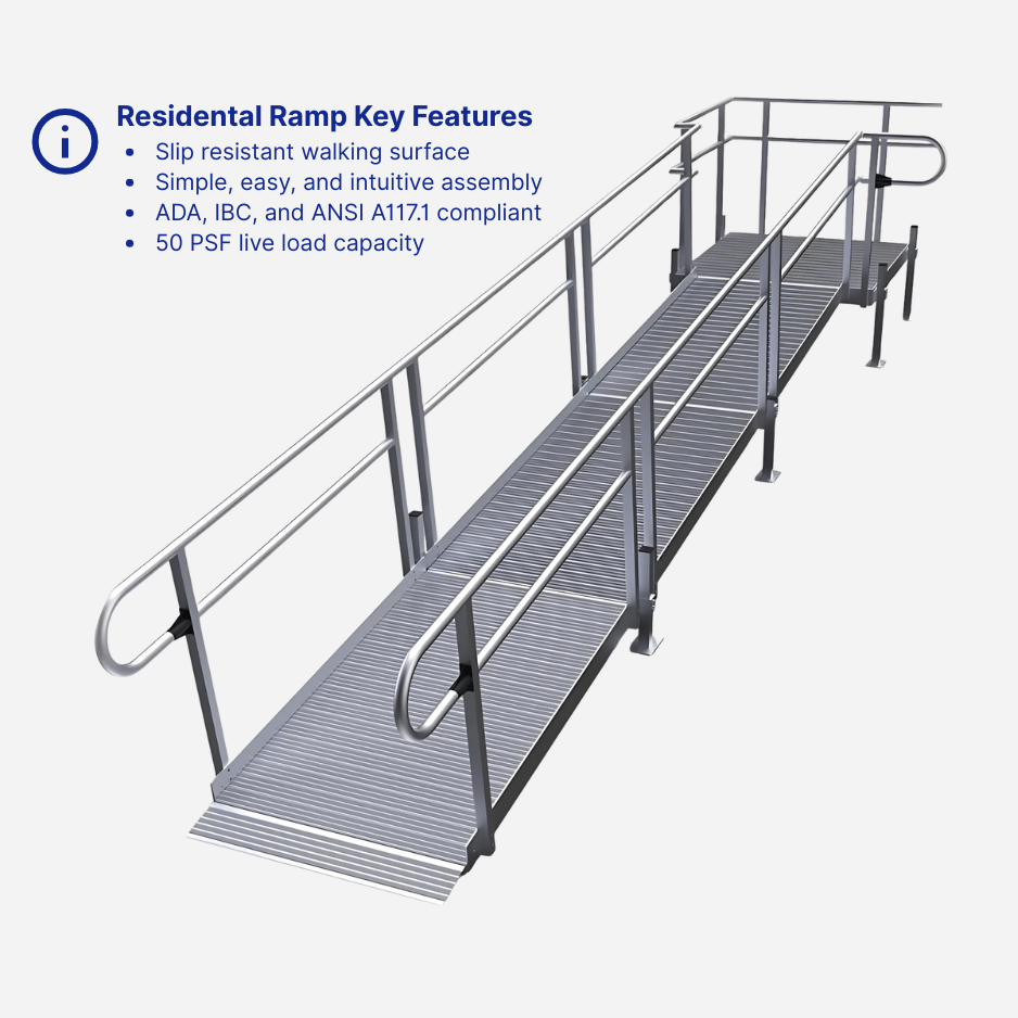 Residential Ramps: Access4u's residential ramp systems are designed with a focus on simplicity and a perfect fit. They use standard, modular components that can be configured to meet the unique requirements of any home. Their slip-resistant walking surface and durable aluminum construction provide a safe and stable path for wheelchairs, scooters, and walkers.